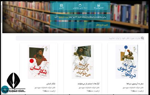 پس از این کاربر وارد صفحه بعد شده و می تواند کتاب های قابل خرید را به صورت یک کارد در ردیف های سه تایی مشاهده نماید. همچنین می تواند کتاب ها را بر اساس دسته بندی بر اساس کتاب فروشی ها، دسته بندی موضوعی و ناشران مشاهده نماید. تصویر زیر نمایان گر این موضوع خواهد که فرد بایستی به آن توجه نماید.