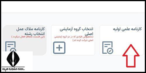 افراد پس از طی مراحل مرتبط با ورود نیاز به این داشته تا بر روی آیتم کارنامه علمی اولیه مطابق عکس قرار داده شده در زیر کلیک نمایند.