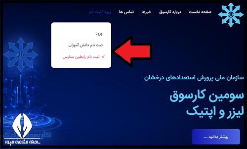 همانطور که در ابتدای مقاله نیز به آن اشاره شد، ثبت نام در کارسوق اپتیک و لیزر از طریق دانش آموزان و رابطین پژوهشی مدارس امکان پذیر است. علاقه مندان به شرکت در کارسوق می توانند پس از مراجعه به سایت ثبت نام کارسوق اپتیک و لیزر به نشانی laser.sampad.gov.ir، بر روی گزینه ثبت نام نوار ابزار صفحه کلیک نموده و اقدام به نام نویسی کنند. به منظور راهنمایی بیشتر علاقه مندان، در ادامه نحوه ثبت نام کارسوق اپتیک و لیزر ۱۴۰۴ ارائه شده است.