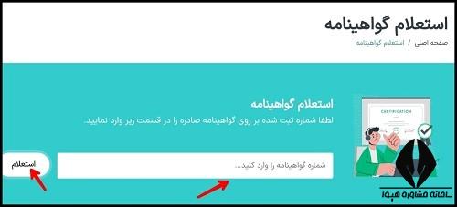 در ادامه فرم استعلام گواهینامه در سامانه جامع مرکز آموزش مدیریت دولتی نمایش داده شده و می توان شماره گواهینامه را در آن تایپ کرد. پس از کلیک بر روی استعلام، جزئیات مدرک مد نظر نمایش داده خواهد شد.