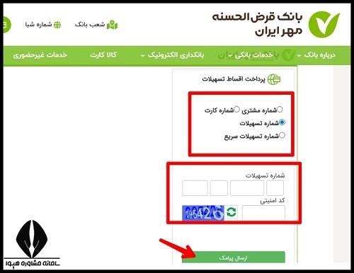 در ادامه می توان یکی از گزینه های موجود مانند شماره مشتری یا شماره تسهیلات را انتخاب کرده و پس از تکمیل فرم با اطلاعات مورد نیاز، یک پیامک دریافت نموده و سپس مراحل واریز را طی کرد.
