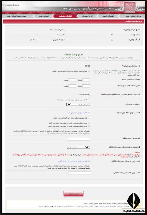 در این بخش یک فرم برای داوطلبان به نمایش در می آید که در آن می بایست نسبت به درج معدل دیپلم و سوابق تحصیلی اقدام نمایند و پس از تکمیل نمودن فرم مذکور بر روی دکمه تایید و ادامه کلیک کنند.