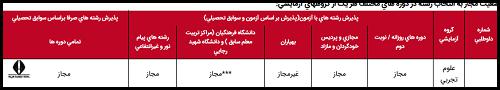منظور از وضعیت مجاز به انتخاب رشته در دوره های مختلف در جدول فوق: در صورتی که داوطلب با توجه به رتبه و تراز اکتسابی و سایر ضوابط و شرایط مندرج در دفترچه انتخاب رشته کنکور، مجاز به شرکت در مرحله انتخاب رشته در دوره های روزانه و غیر روزانه باشد، عبارت مجاز و در غیر این صورت عبارت غیر مجاز درج می شود.