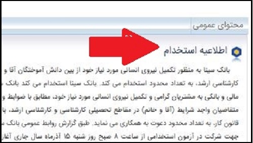 با ورود به سایت بانک سینا متقاضیان باید بر روی گزینه استخدام در بخش اطلاعیه ها کلیک نمایند.