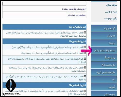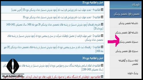 ابتدا داوطلبان سایت مرکز سنجش آموزش پزشکی به نشانی sanjeshp.ir را در مرورگر خود جستجو کرده و وارد صفحه اصلی این سایت شوند. در این صفحه از منوی سمت راست، بر روی گزینه تخصصی و فوق تخصصی پزشکی کلیک نمایند.