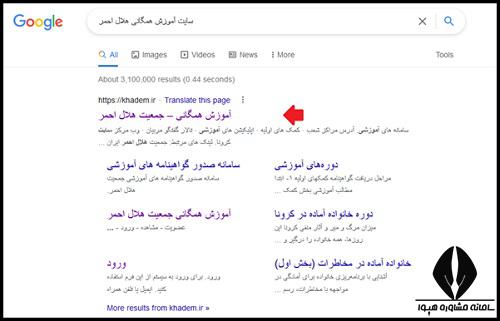 ابتدا در یکی از مرورگرهای خود عبارت "سایت آموزش همگانی هلال احمر" یا " learn.khadem.ir " را جستجو کنید. حال بر روی اولین سایت جستجو شده در گوگل کلیک کنید تا به سایت وارد شوید.
