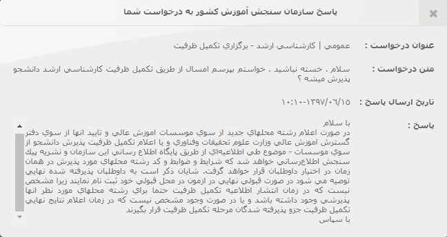 بر اساس اعلام سازمان سنجش در صورت اعلام رشته محل های جدید مرحله تکمیل ظرفیت کارشناسی ارشد 97 برگزار خواهد شد .